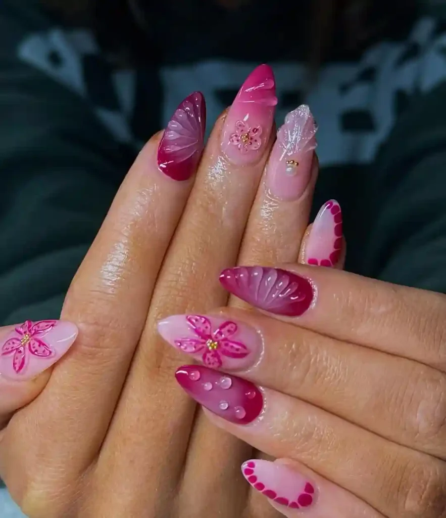 This bold set features a mix of deep pink and magenta aura bases decorated with sculpted petals, droplets, and 3D flowers. Some nails show butterfly wing-like effects while others showcase layered petal designs and pearl accents. The pointed almond shape adds a dramatic edge. If you’re into maximalist nail art that still stays elegant, this design brings plenty of flair. Perfect for birthdays, photoshoots, or anyone who wants a mini bouquet on their fingertips.