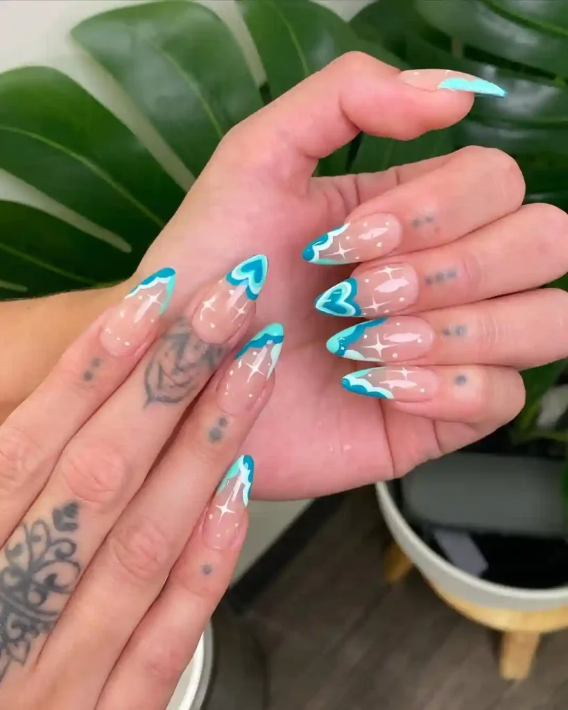 These pointed nails combine aqua-colored French tips with layered heart shapes at the center of the tips. White star-like sparkles are scattered across the nude base, giving a magical, ocean-inspired look. A fun and unique choice for summer adventures, poolside days, or seaside escapes.
