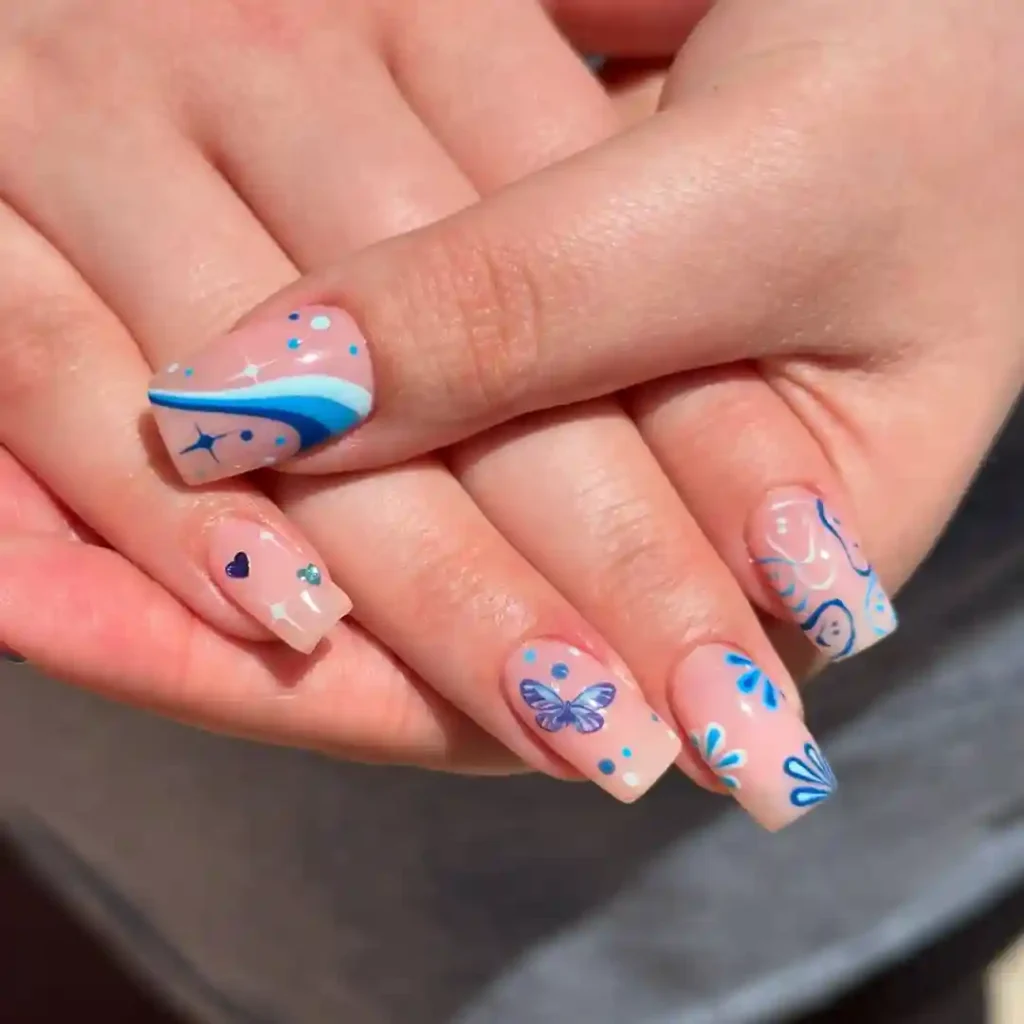 Bringing a modern and playful twist, these square nails combine blue and white waves, tiny stars, hearts, and butterfly details on a nude base. The different patterns on each nail create a mix-and-match effect that feels trendy yet wearable. Great for beach trips or any casual summer event.