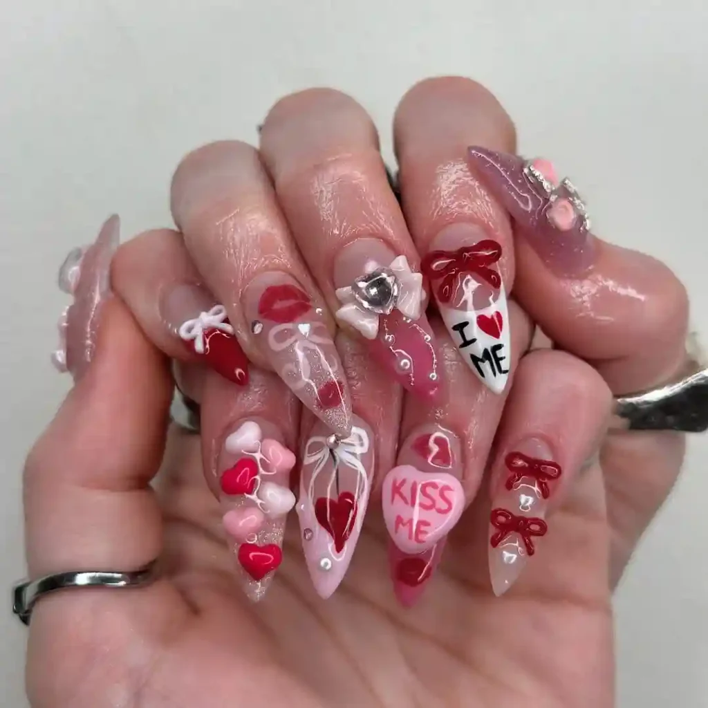 These nails bring a fun twist to summer with their bold mix of reds, pinks, and glossy finishes. The long, pointed tips are decorated with 3D hearts, romantic lip prints, shiny bows, and phrases like “KISS ME” and “I ❤️ ME.” Perfect for those who want a striking, love-inspired manicure, this design blends cute and edgy elements, making it a hit at summer festivals, beach dates, or girls’ nights out.