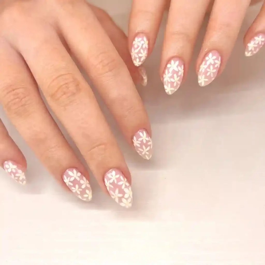 This fresh floral look covers every almond-shaped nail with crisp white daisies over a soft pink background. The clean, repeated daisy pattern gives off a simple, classic charm that’s ideal for summer weddings, garden parties, or just adding a touch of sunshine to your everyday style. These nails are easy to wear and match with everything from casual denim to floaty sundresses.