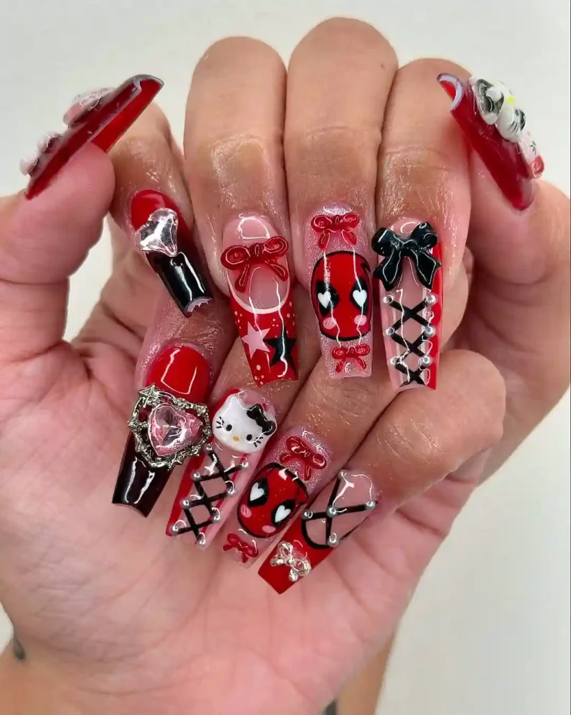 These dramatic nails take inspiration from comic book fun and mix it with a chic lace-up look. Featuring red and black tones, 3D bows, and Deadpool’s unmistakable face, these long square nails make a bold summer statement. Silver heart charms, stars, and tiny Hello Kitty accents add a quirky twist. Whether you’re heading to a summer cosplay event or just love standing out, these nails deliver serious attitude.