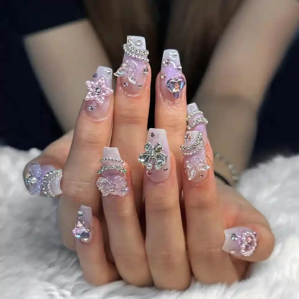 This design is all about sparkle and luxury. The long coffin nails feature soft lavender shades paired with chunky rhinestones, butterflies, stars, and crystal bows. The 3D elements and shimmering finishes create a show-stopping look, perfect for summer nights out, weddings, or vacations where you want your nails to be the main accessory.