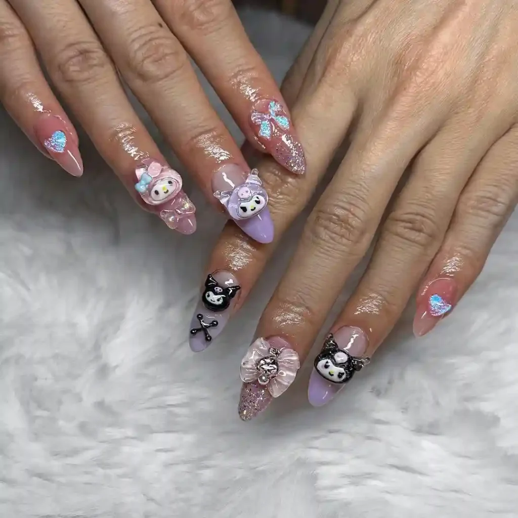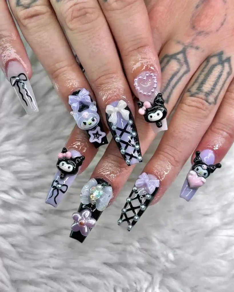 8. Lavender Kuromi & Hello Kitty Summer Nails