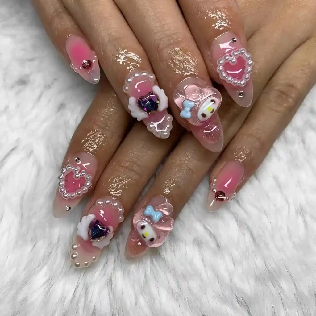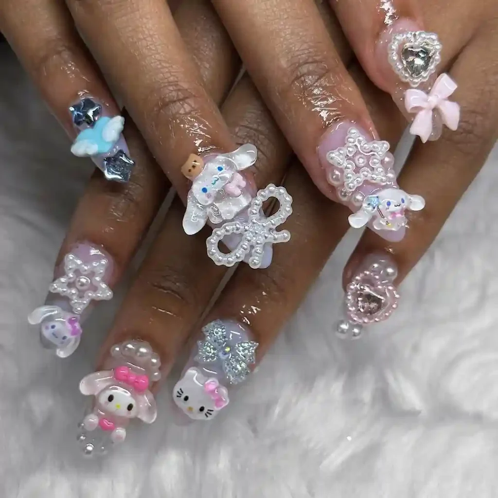 These nails are packed with adorable 3D details like My Melody, Hello Kitty, and Cinnamoroll charms surrounded by pearls, hearts, and bows. The pale pink and clear base keeps the design feeling airy, while the sparkly accents give off magical summer vibes. Great for those who want their nails to be playful and full of character.