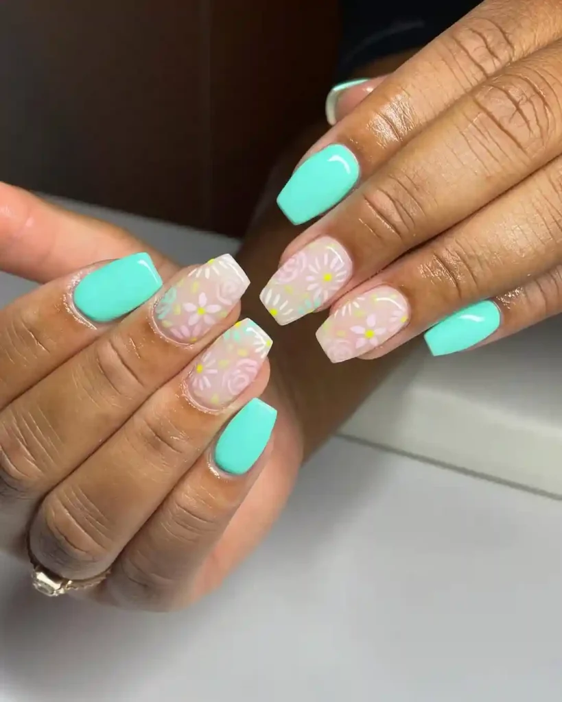 These square nails mix glossy mint green with transparent bases covered in soft pink floral art and tiny white daisies. The mint gives a fresh, cool vibe, while the floral designs add a light, breezy feel that fits perfectly for summer garden parties, picnics, or casual sunny-day outings.