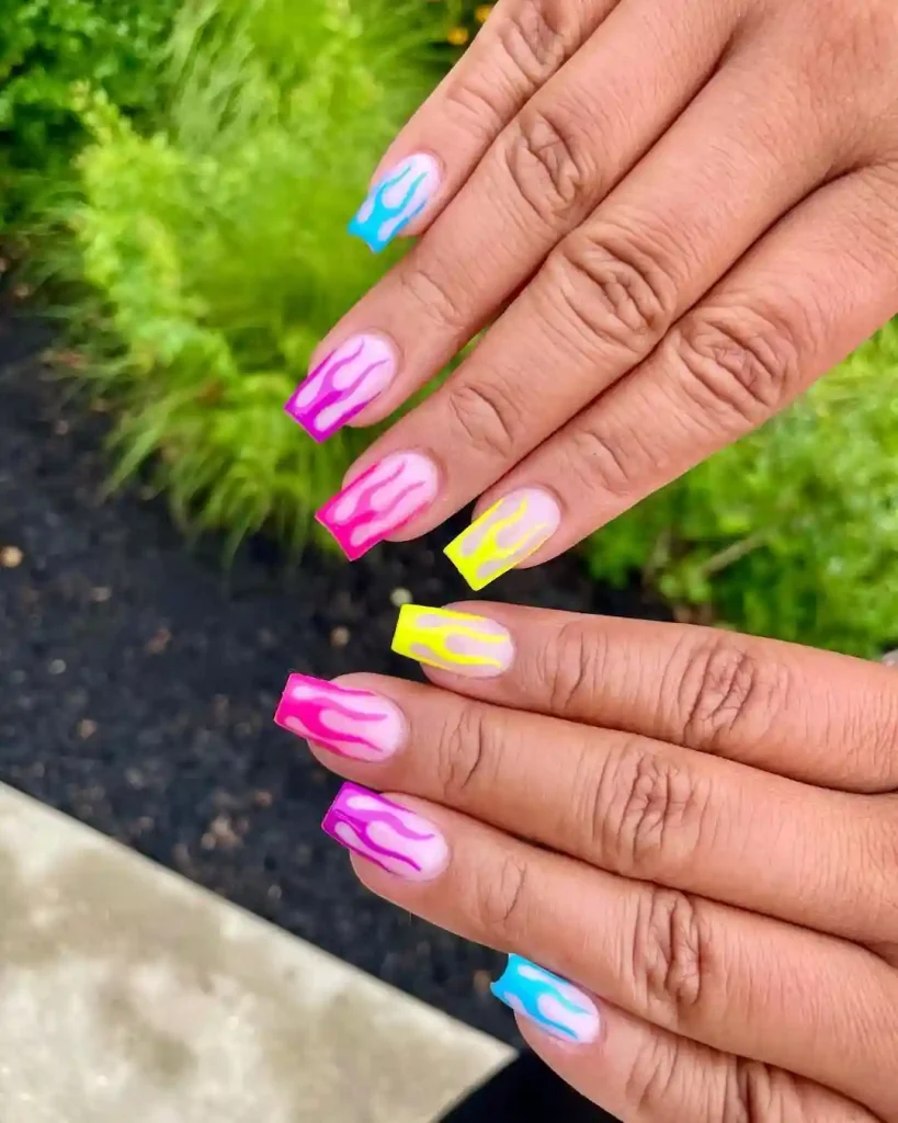 These bright nails bring the heat with neon pink, yellow, and blue flame tips on a soft nude base. The square shape keeps the look clean, while the bold colors make a fun statement. These nails are perfect for festivals, pool parties, or anywhere you want your nails to stand out.
