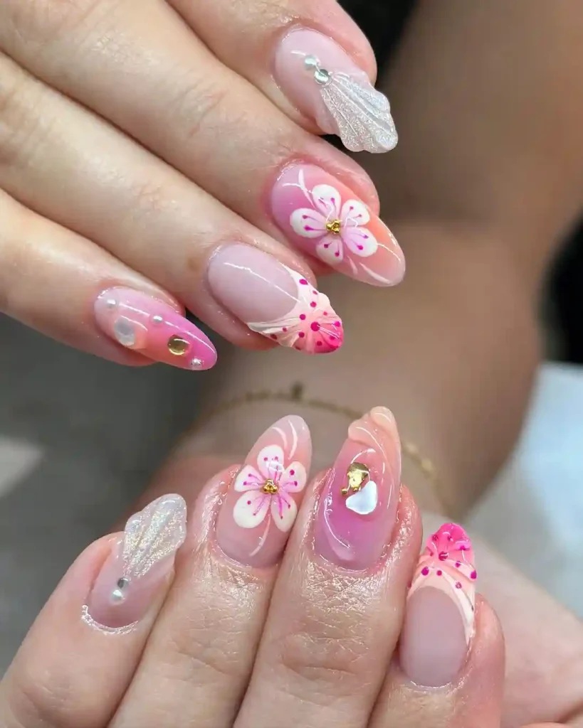 These almond-shaped nails feature soft pink tones, delicate hibiscus-style flowers, and shiny pearl-like accents. The blend of hand-painted petals and shimmering designs gives off tropical vacation energy — ideal for those wanting an elegant yet fun summer manicure.