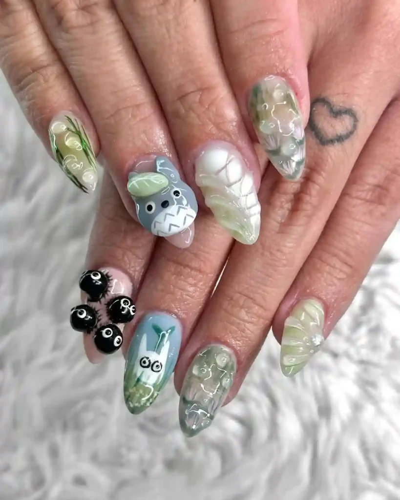 For a playful touch of fantasy, these nails showcase 3D Totoro, soot sprites, and leafy details in soft greens and pale blues. Each almond-shaped nail tells a little story, blending natural elements with a fun, cartoon twist. These are great for fans of Studio Ghibli or anyone looking for a whimsical summer nail design.