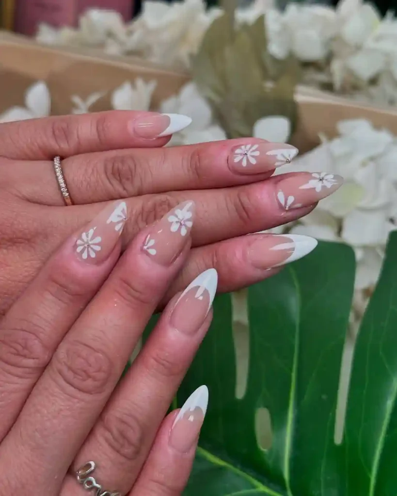 A subtle and classic look, these almond nails combine delicate white French tips with simple daisy details on a nude base. The small gold centers in the flowers add just a hint of sparkle, making them perfect for brides, garden parties, or anyone seeking a clean, summery style.