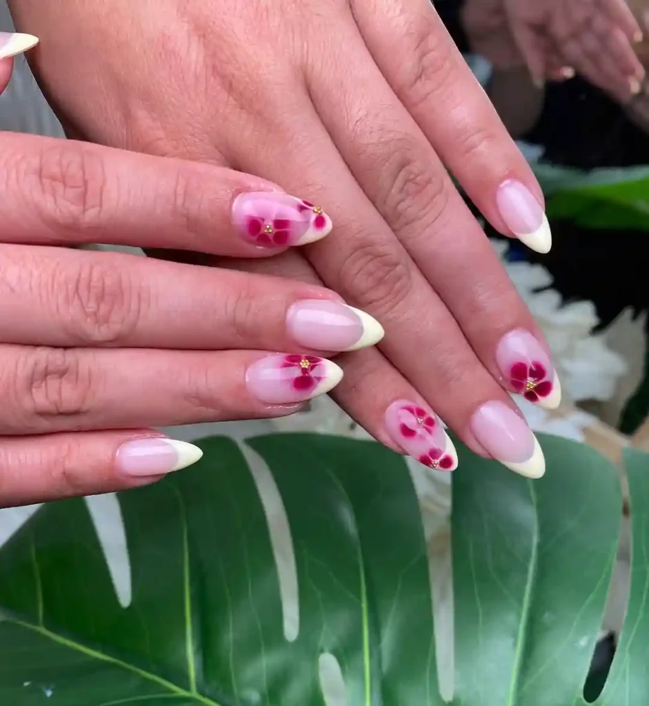 These almond nails offer a fresh summer twist with soft yellow French tips paired with deep pink flowers. The floral accents are placed near the cuticles, adding dimension while keeping the look light and breezy. Perfect for sunny weekends or tropical getaways.