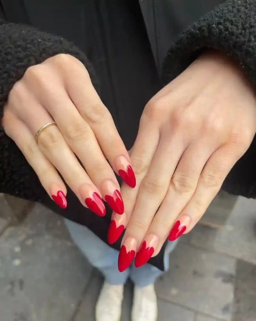 A softer take on heart tips, these almond nails blend sheer pink bases with red heart-shaped edges. The look feels romantic, gentle, and very wearable. This style is great if you want Valentine nails that feel feminine and polished rather than loud. Ideal for everyday wear throughout February and perfect for minimal nail lovers.