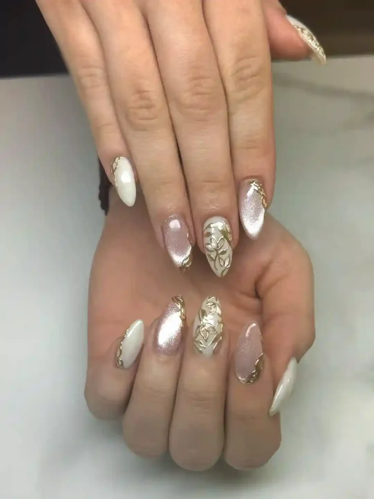 This luxurious design blends soft nude, pearl white, and champagne tones with gold foil and raised floral details. The finish feels elegant and high-end. Perfect for Valentine’s dinners, weddings, or special February events. These nails are ideal if you want something romantic but classy, with texture and shine that feels refined.