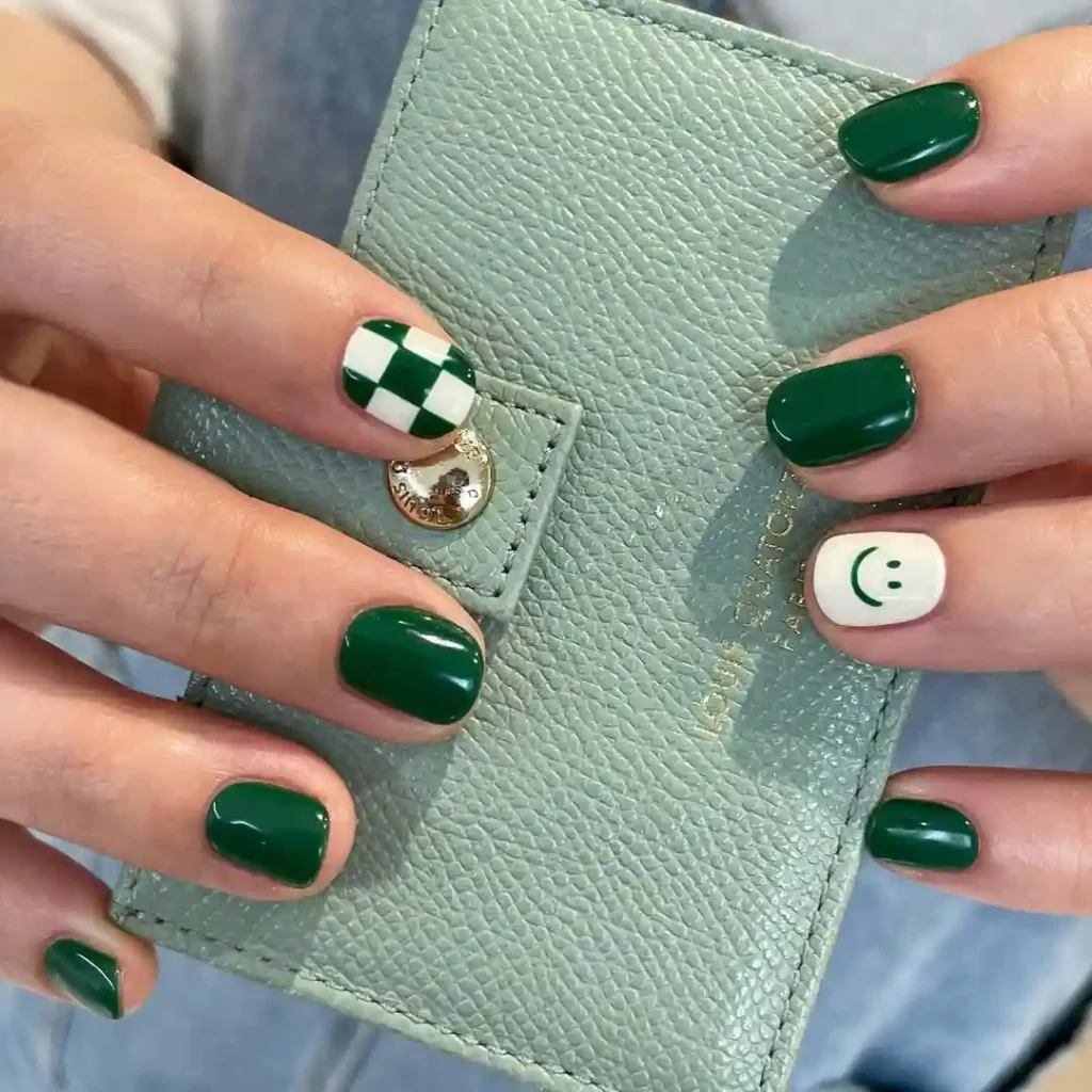 Bold and playful, these glossy green nails stand out instantly. The checkerboard accent nail adds a fun twist, while the tiny smiley face gives it a trendy, youthful vibe. This design is perfect if you want February nails that feel fresh and different from typical Valentine styles. Great for everyday wear, creative moods, or anyone bored of pink and red.