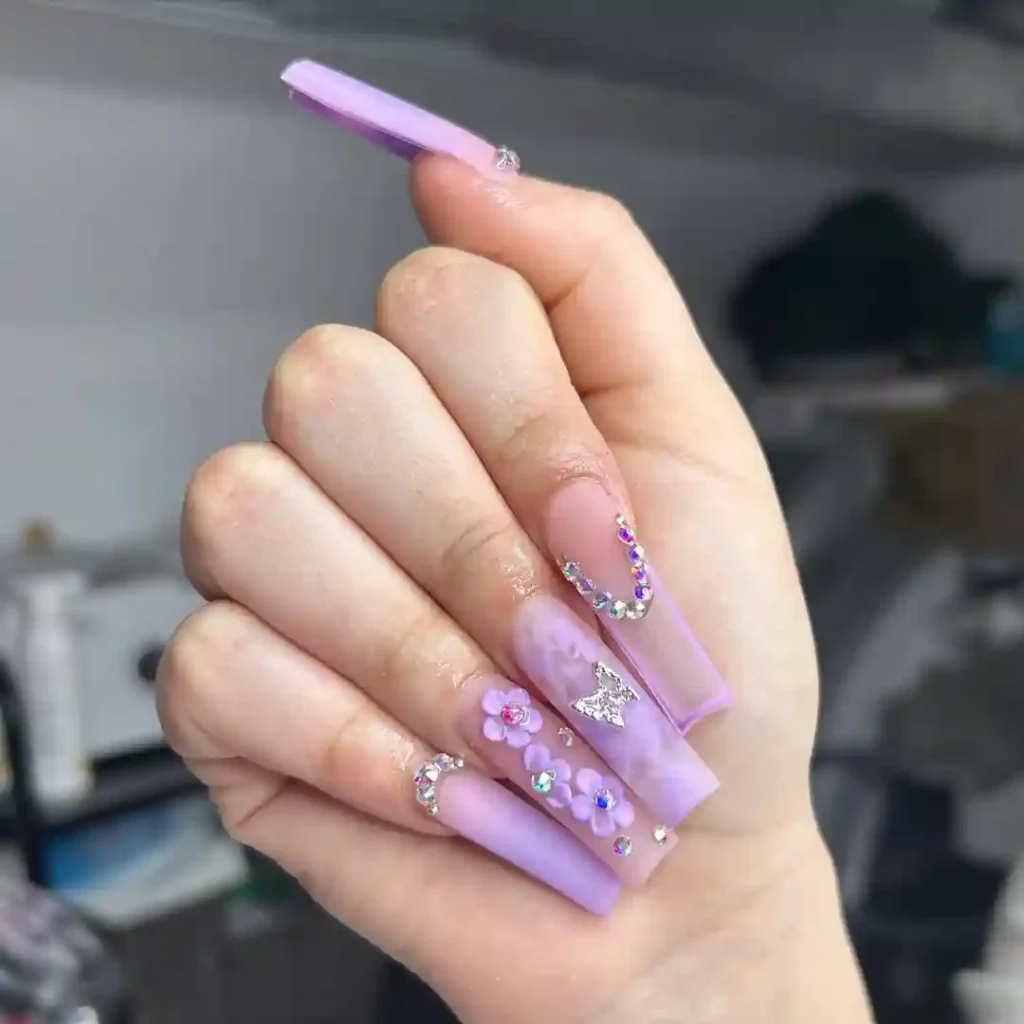 These long lavender coffin nails stand out with soft purple tones, crystal accents, and raised floral art. The mix of shine and texture makes this set feel bold and eye-catching. Great for February birthdays, parties, or anyone who loves statement nails. This design is perfect if you want something romantic without using classic red or pink.