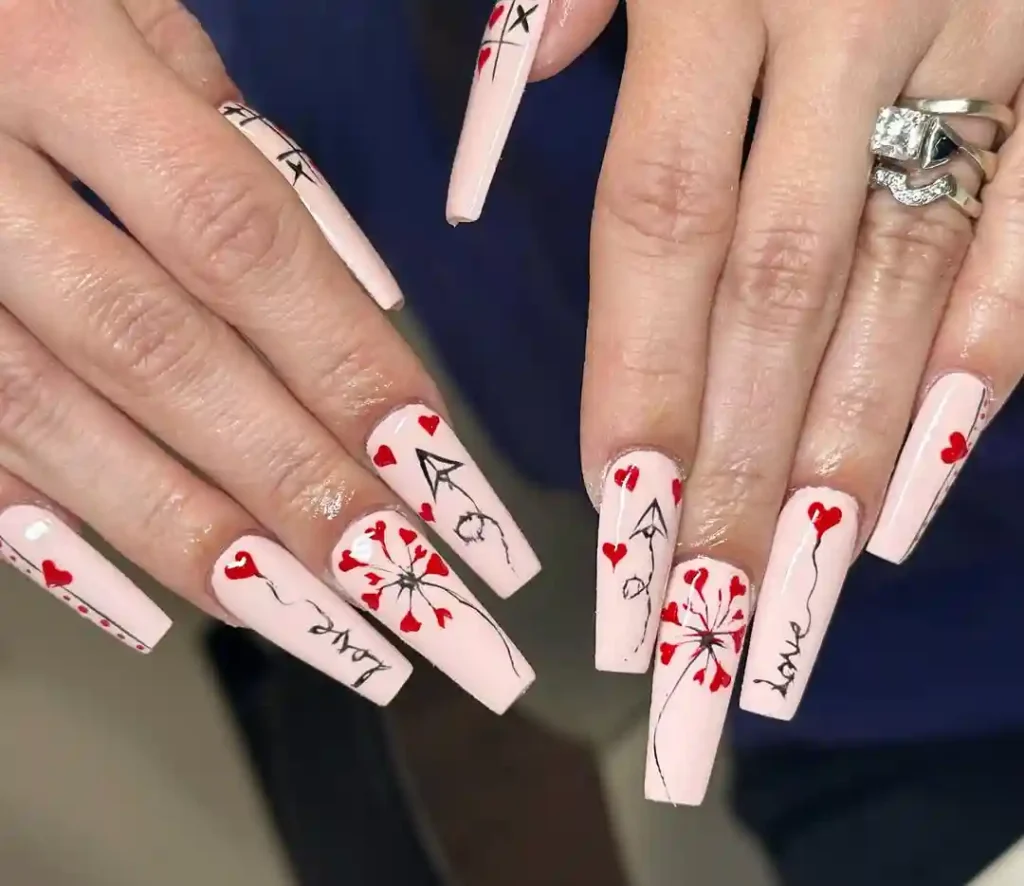 These long coffin nails use a soft blush pink base paired with red heart arrows and fine black line art. The details feel artistic and playful without looking messy. This design is great for Valentine’s Day if you want something expressive and bold. It works well for statement lovers who enjoy nail art that tells a little story and stands out in photos.