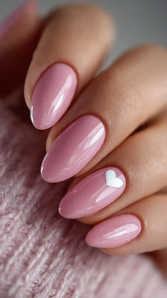 Clean and elegant, these almond-shaped nails feature a glossy soft pink finish with a single white heart accent. The simplicity is what makes this look so appealing. It’s perfect for anyone who loves minimal Valentine nails that still feel special. Great for daily wear, cozy February outfits, and subtle romantic looks.