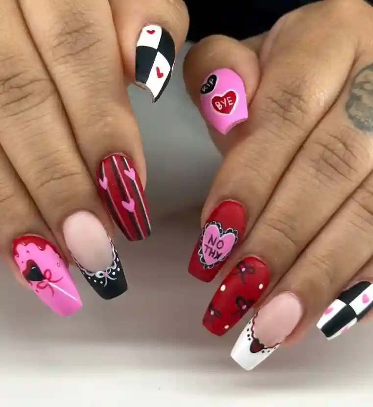 This edgy mix-and-match set features bold reds, pinks, black accents, and playful phrases like “bye” and “no thx.” Each nail has its own personality, making the whole look fun and rebellious. It’s perfect for February if you want Valentine nails with attitude instead of romance. Ideal for creative moods, parties, or anyone who likes nails that spark conversation.