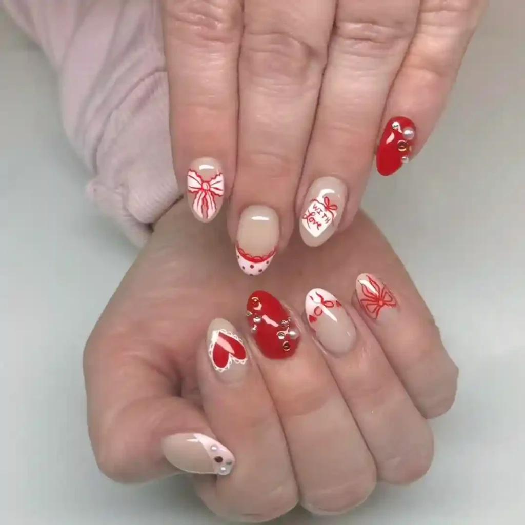 This playful Valentine manicure mixes nude and red tones with bow designs, heart accents, and small gems. Each nail feels different but still ties together beautifully. It’s a fun option for February if you want detailed nail art without going too long. Perfect for Valentine’s Day events, gift photos, or anyone who loves cute, decorative nails.
