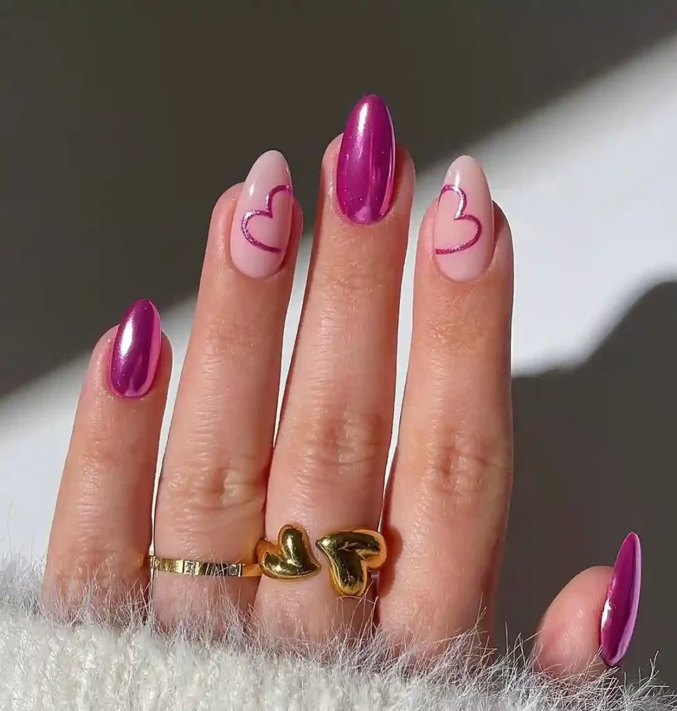 Glossy pink chrome nails steal the spotlight here, paired with soft nude nails outlined with heart-shaped line art. The mix of shine and simplicity keeps the look balanced. These nails are perfect for February if you want something modern and stylish. They photograph beautifully and feel trendy without being too loud.