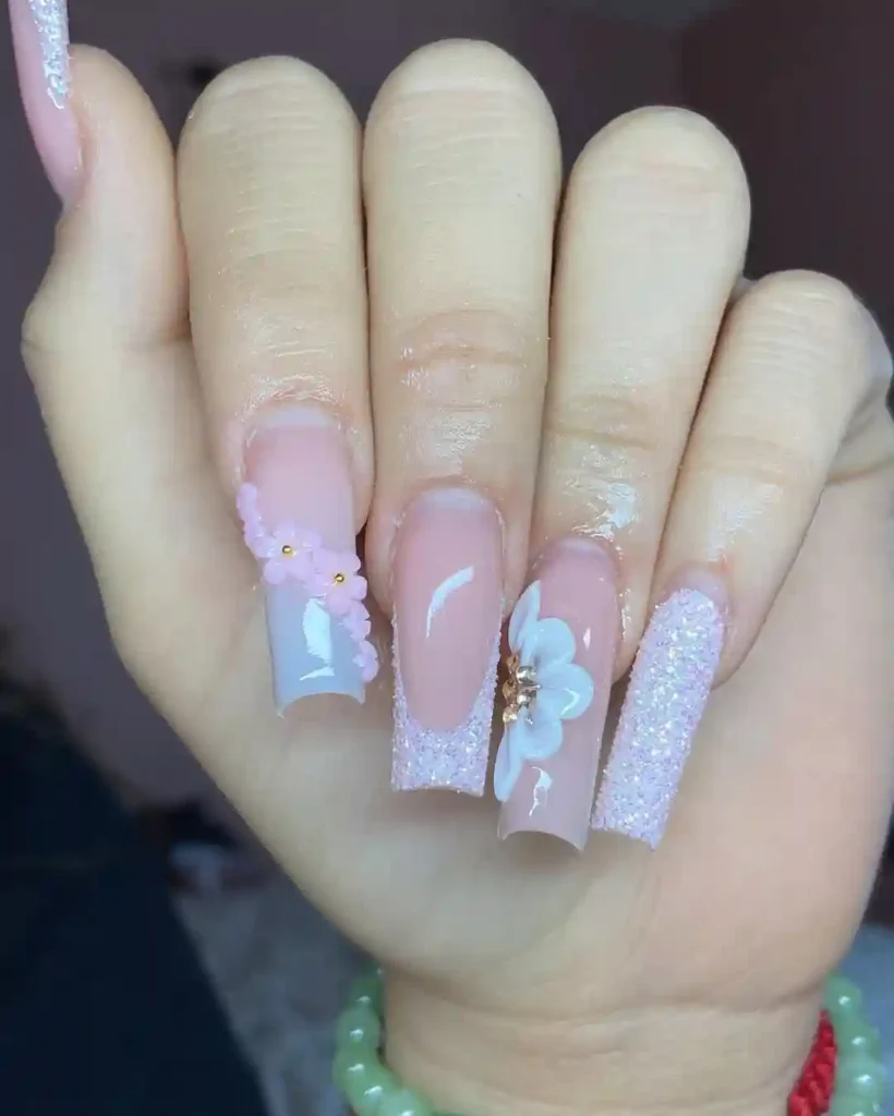 These long coffin nails combine soft pink tones with delicate 3D floral designs and glitter accents. The mix of texture makes this manicure feel extra special and detailed. It’s a great choice for February celebrations, date nights, or special events where you want your nails to stand out. This look is all about elegance with a touch of drama.