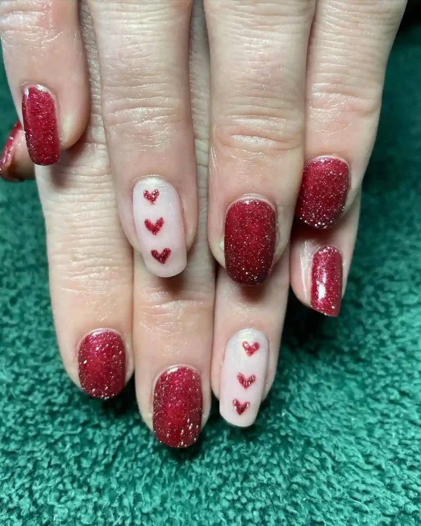 This manicure pairs deep red glitter nails with a soft nude accent nail decorated with tiny red hearts. The sparkle adds drama while the hearts keep it festive. It’s a great choice for Valentine’s Day nights out or special dinners. This design balances glam and romance in a way that still feels easy to wear.