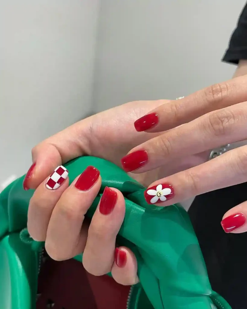 These glossy red nails are paired with a cute white daisy accent and a subtle checker detail for contrast. The bold color keeps it classic, while the floral touch adds charm. This look works beautifully for February and transitions easily into early spring. A great choice if you want bright nails with a fun but simple twist.