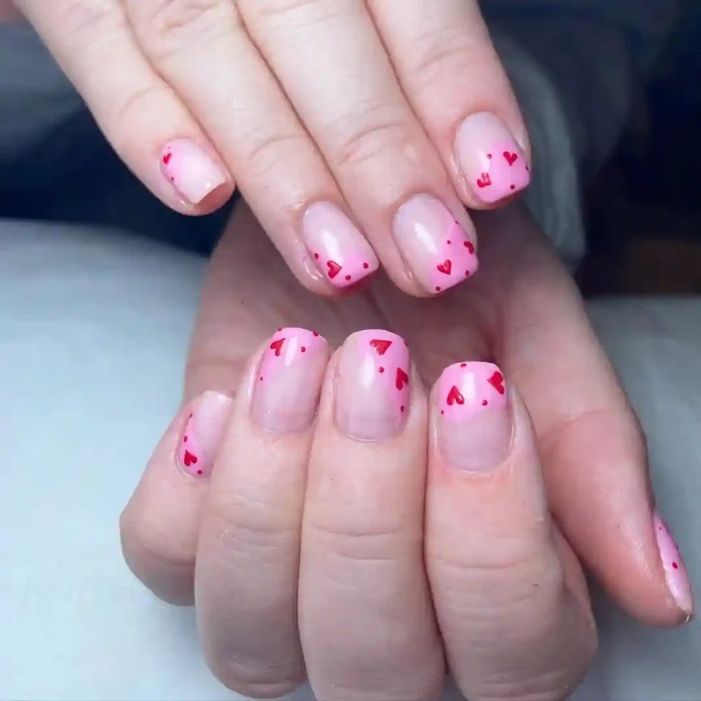 These short, natural nails feature a soft pink base topped with tiny red heart details scattered across each nail. The look feels sweet, light, and very wearable for everyday February plans. Perfect if you love Valentine nails but want something subtle and low-maintenance. This style works great for short nails and looks especially cute in close-up photos.