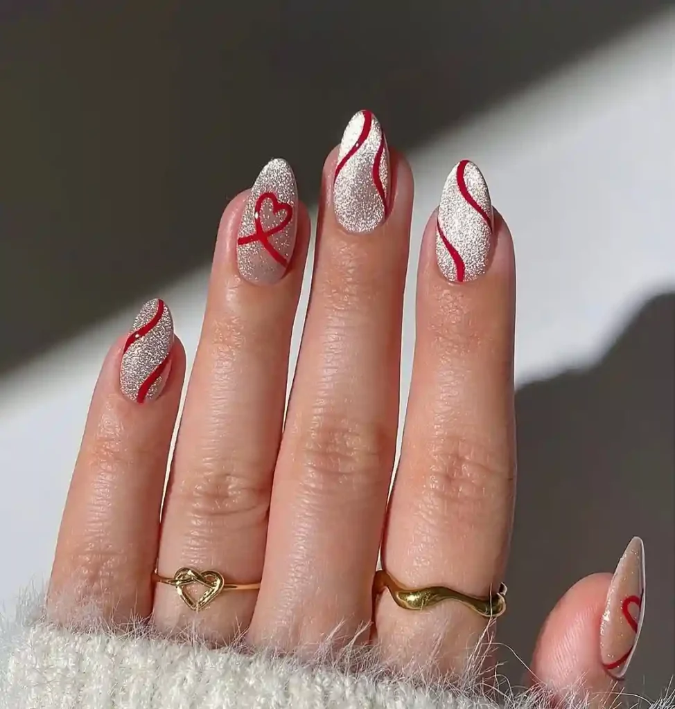 These almond-shaped nails feature a sparkling silver base paired with flowing red line designs and heart details. The contrast between glitter and fine lines makes this look eye-catching but still elegant. Perfect for Valentine’s parties or special evenings, this design feels romantic without relying on heavy pink shades.