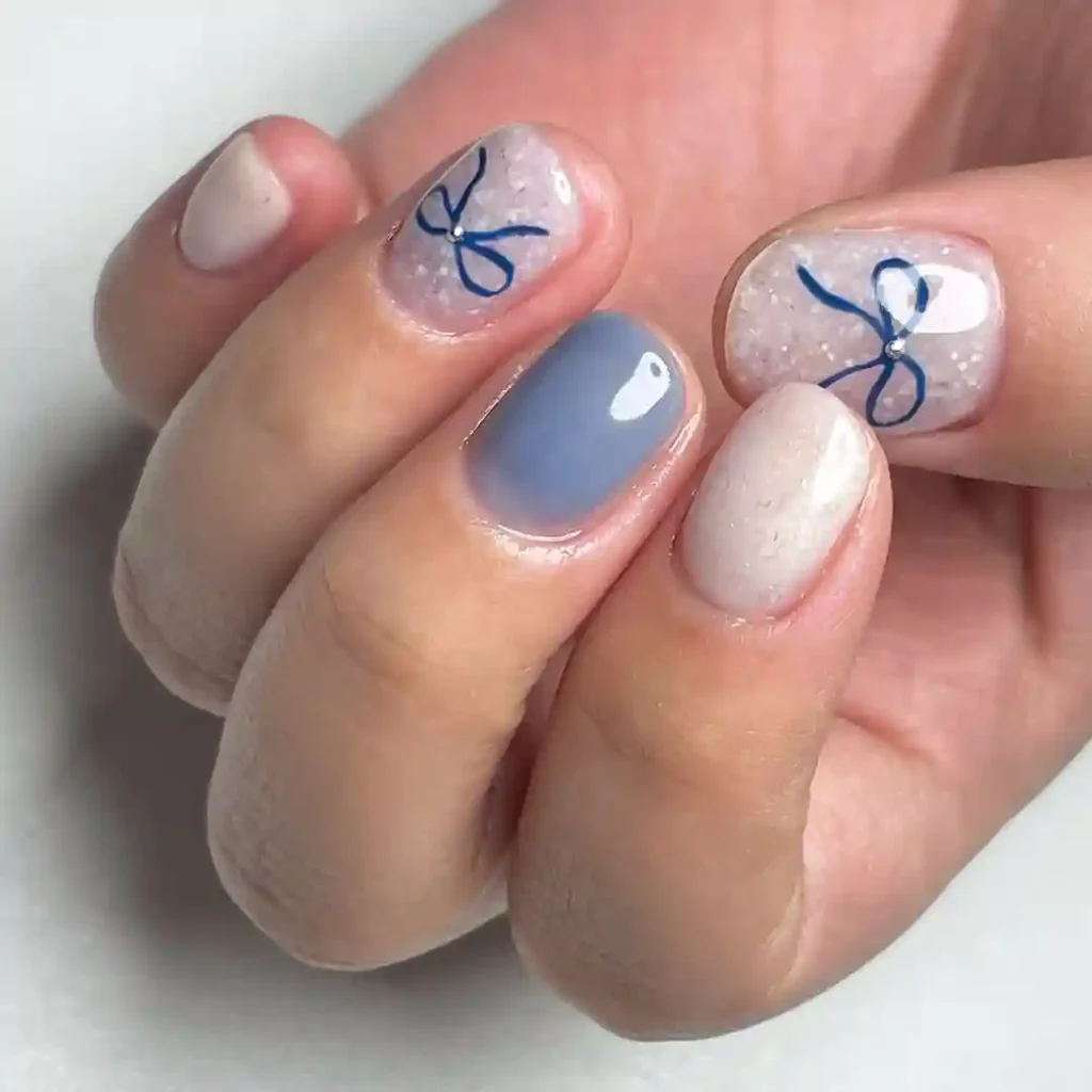 This design blends soft nude shades with muted blue accents and delicate bow details. The overall look feels calm, elegant, and slightly playful. It’s a refreshing February nail idea if you want something different from hearts. Perfect for minimal lovers who still want a unique design that looks neat, polished, and easy to wear.