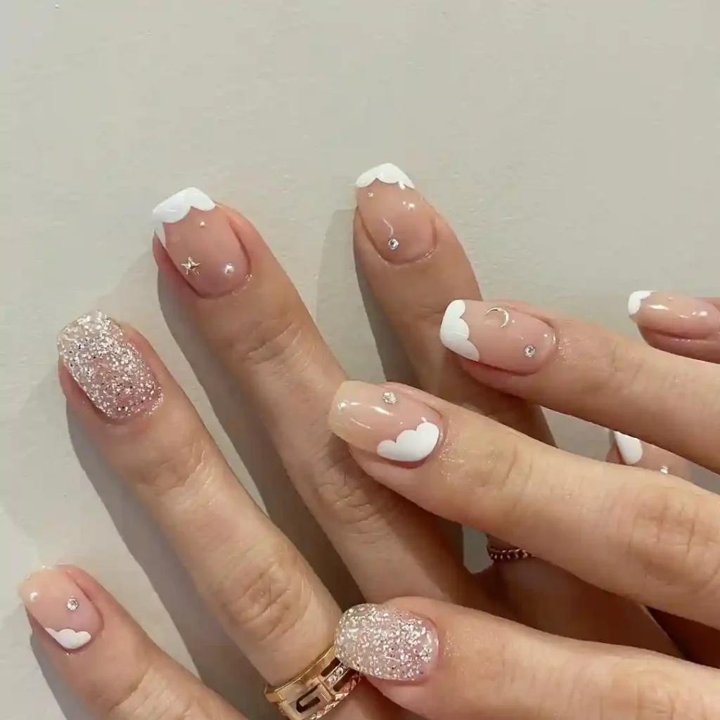 This design keeps things clean and romantic with a sheer nude base and soft white French tips shaped into subtle hearts. A few tiny gems add just enough shine without taking over the look. These nails are ideal for Valentine’s Day, engagement dinners, or anyone who prefers simple but meaningful nail art that looks beautiful up close and in photos.