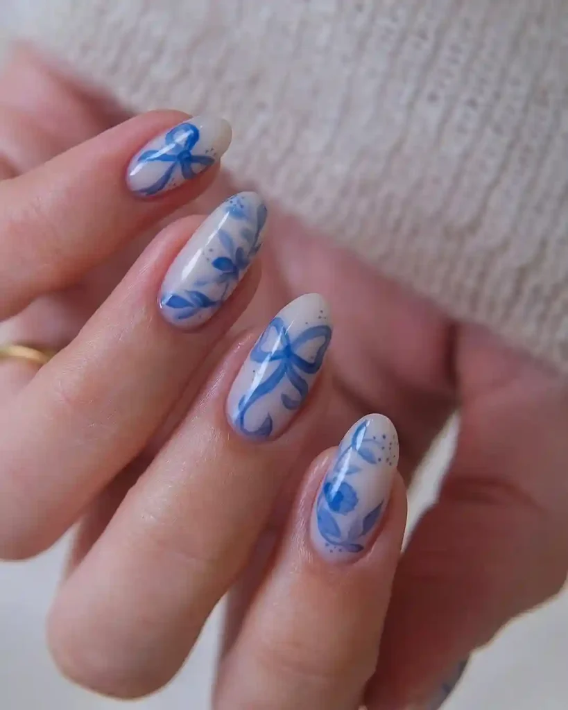 14. Blue Floral Art on Milky Nude Nails