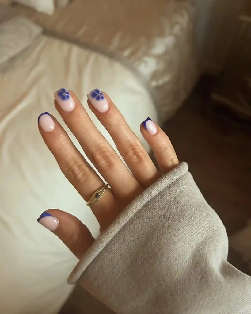 24. Blue Flower French Tips on Short Nails