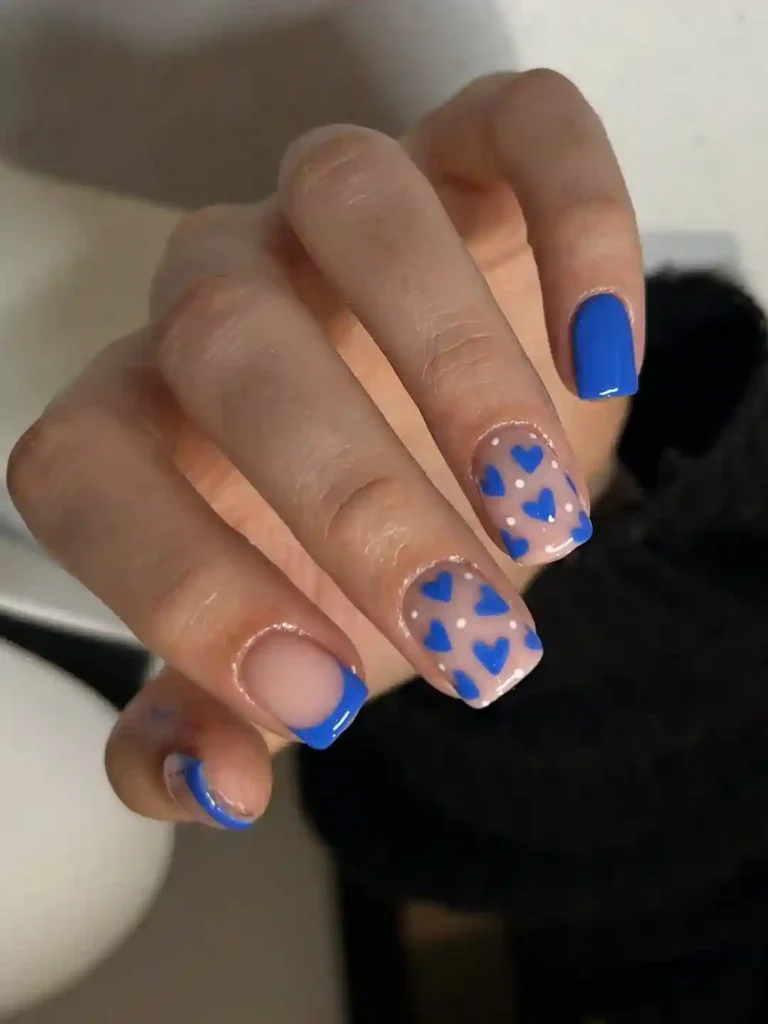 9. Blue and Pink Heart French Tips