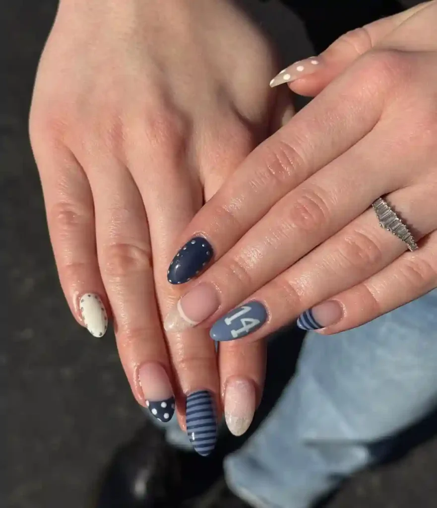 This manicure mixes dots, stripes, and soft nude shades with cool blues. Each nail feels unique but still tied together by the color palette. It’s a great example of January nail art that feels creative while staying wearable for daily life.