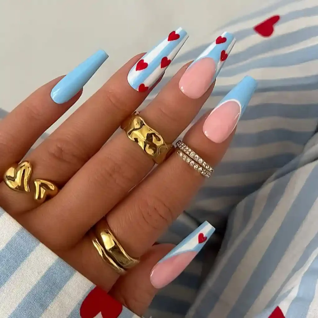 This long coffin set mixes pastel blue and soft pink with red heart accents. The French tip placement keeps it structured while the hearts add charm. It’s a cute crossover between January nail ideas and early Valentine’s nail inspiration.