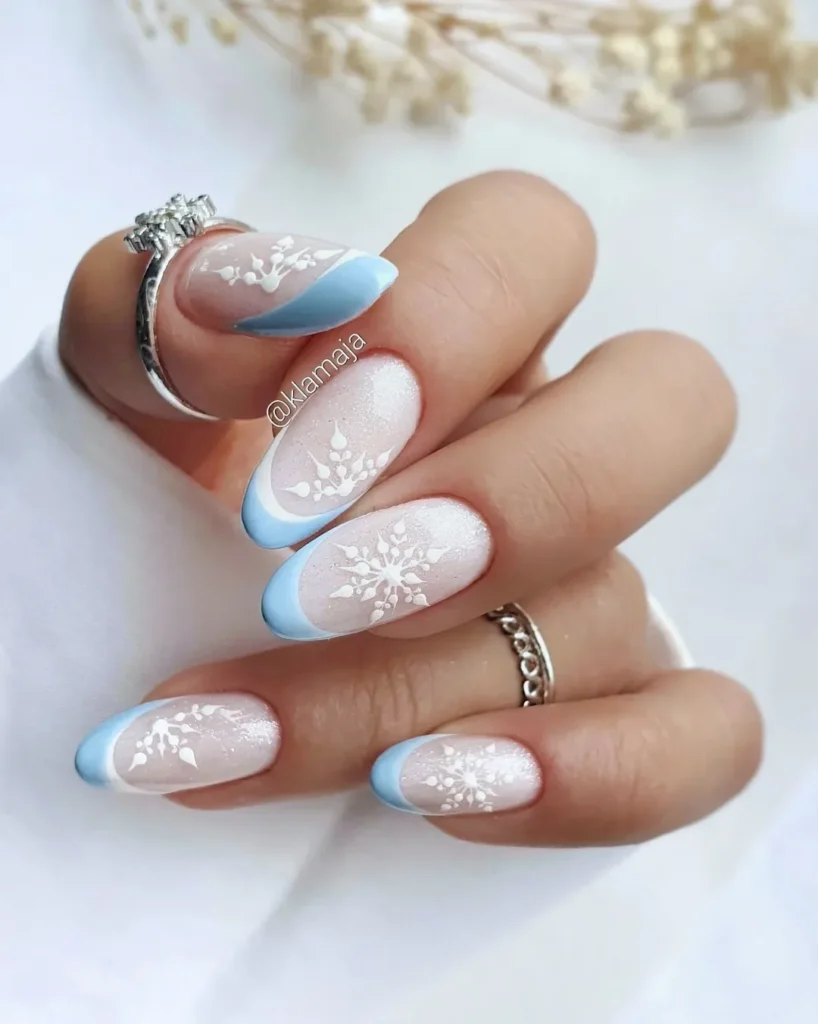 These almond-shaped nails feature a soft milky nude base with icy blue French tips and fine white snowflake art. The shimmer keeps them from looking flat, while the design still feels wearable for everyday January looks. This is a solid choice for winter nail ideas that feel clean, calm, and seasonal without going full holiday mode.