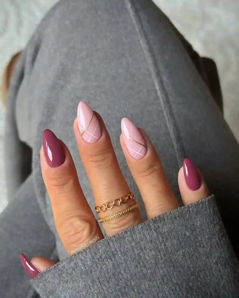 These almond nails mix rich mauve with soft blush pink for a cozy winter palette. The thin crisscross lines add just enough detail without taking over the look. This design feels grown, calm, and wearable ideal for January when bold colors feel like too much but plain nude feels boring.