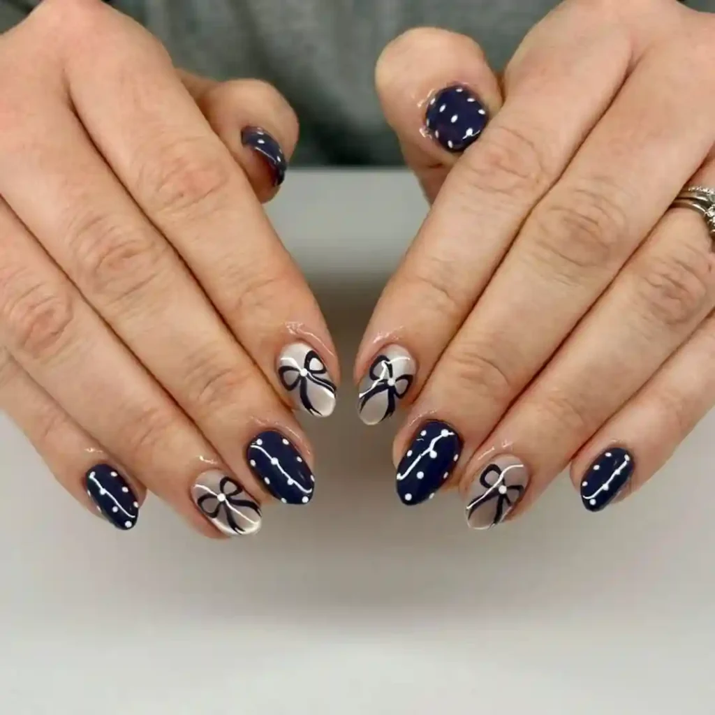 This manicure pairs deep navy nails with soft neutral tones and bow-inspired designs. The mix of dots and lines keeps it elegant but playful. It feels cozy, put-together, and perfect for winter outfits, making it a strong January nail design choice.