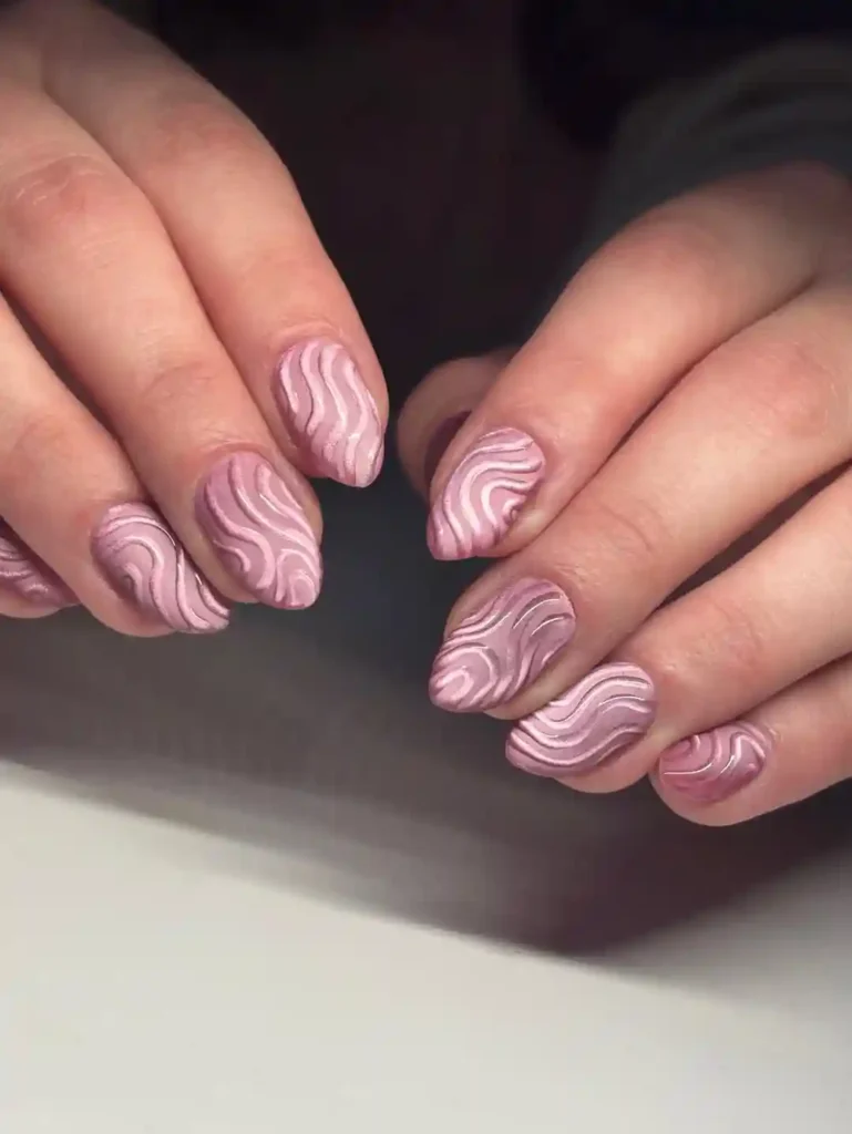 These pink nails feature raised swirl textures with a pearly chrome finish. The shine is soft, not loud, which works well for January. If someone wants winter nails that feel special but still wearable, this set is a strong pick.