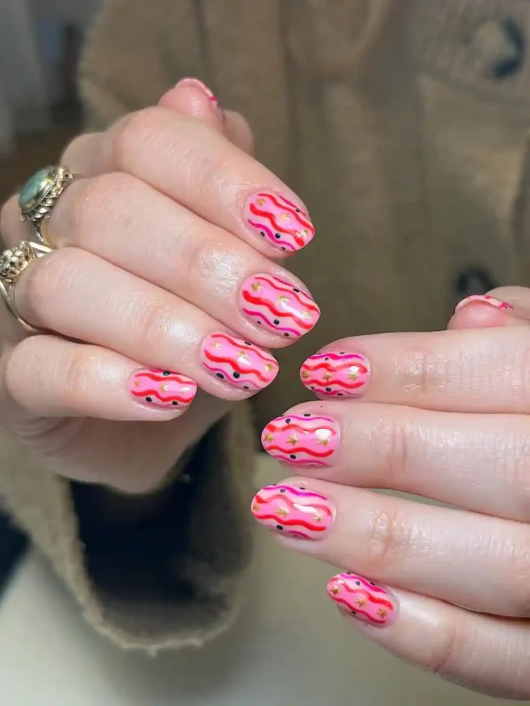 These pink nails are decorated with soft wavy lines, tiny black dots, and small gold stars. The design feels cheerful and creative, making it ideal for lifting winter moods. This is a great example of January nails that don’t feel dull at all.