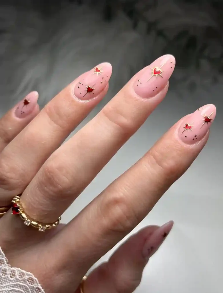These almond nails feature a blush pink base topped with tiny red star accents and delicate gold studs. The design feels subtle at first glance but has just enough detail to catch the eye. It’s a great January nail look for anyone who wants something feminine and polished without going full sparkle or heavy winter themes.