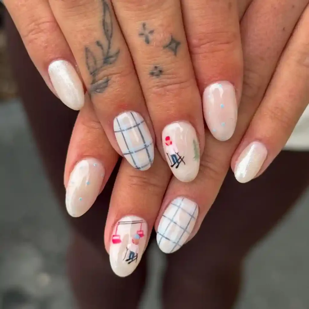 This set mixes creamy nude shades with soft blue plaid patterns and tiny winter illustrations. The muted colors keep everything calm and wearable, while the playful art adds personality. These nails feel cozy and creative, making them perfect for January outfits, chunky knits, and relaxed winter days.