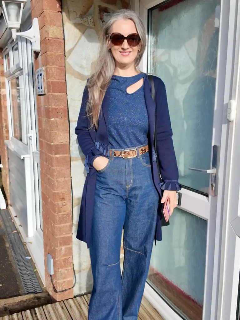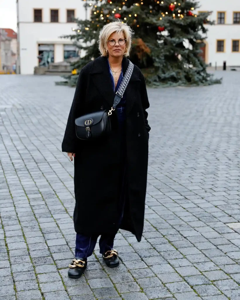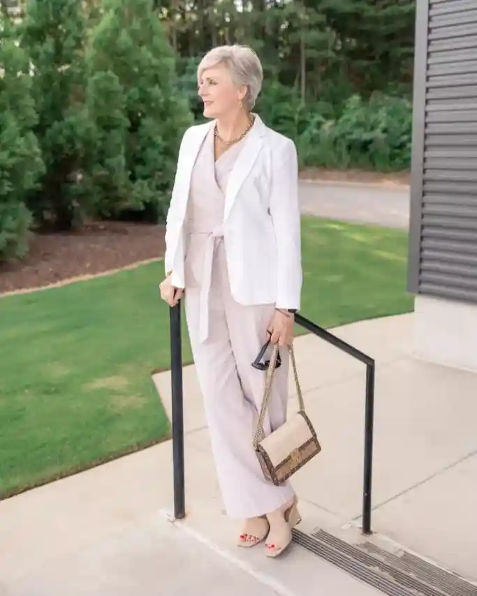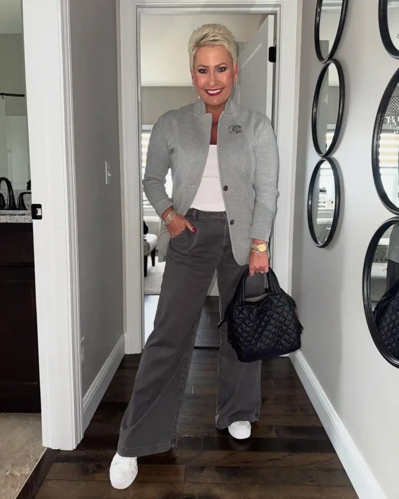 It’s a great option if you want something modern but still age-appropriate. The shorter jacket avoids bulk around the hips, while the wide-leg trousers add movement and comfort. This is the kind of outfit that works for both casual meetings and city outings.