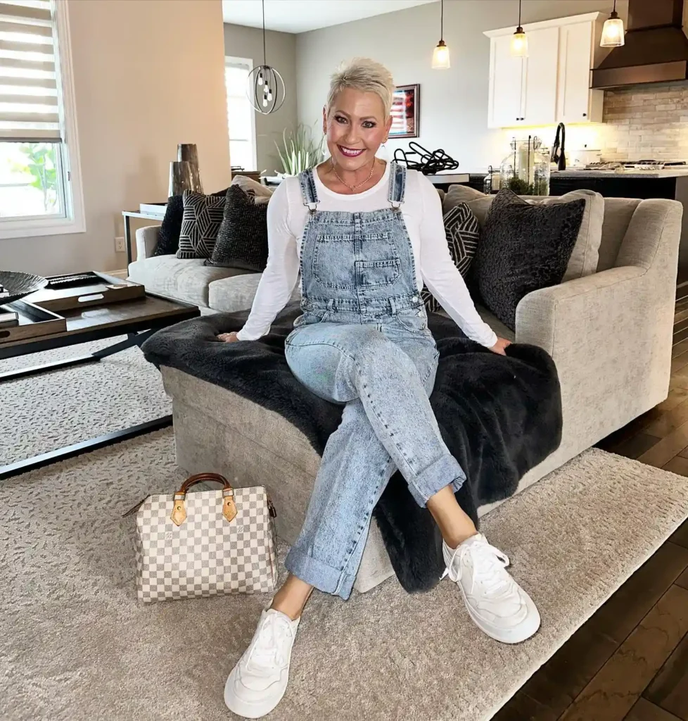This outfit leans into comfort but still looks fresh. Denim overalls paired with a simple long-sleeve top create an easy, relaxed vibe. It’s playful without feeling too young because the fit is clean and structured.