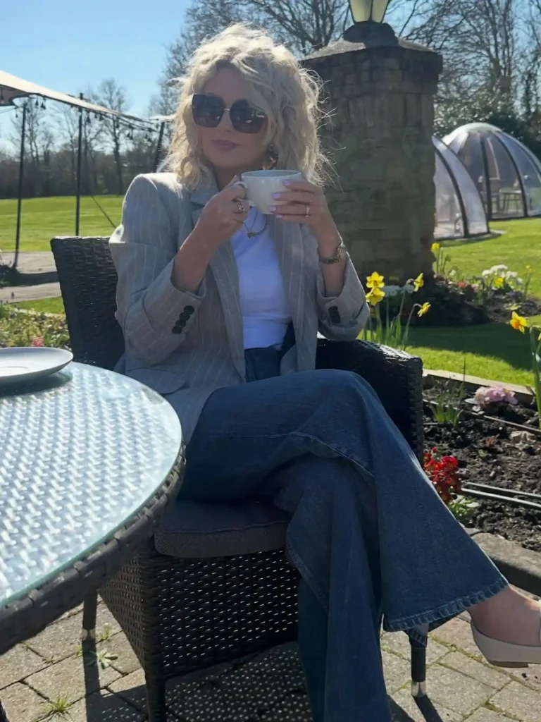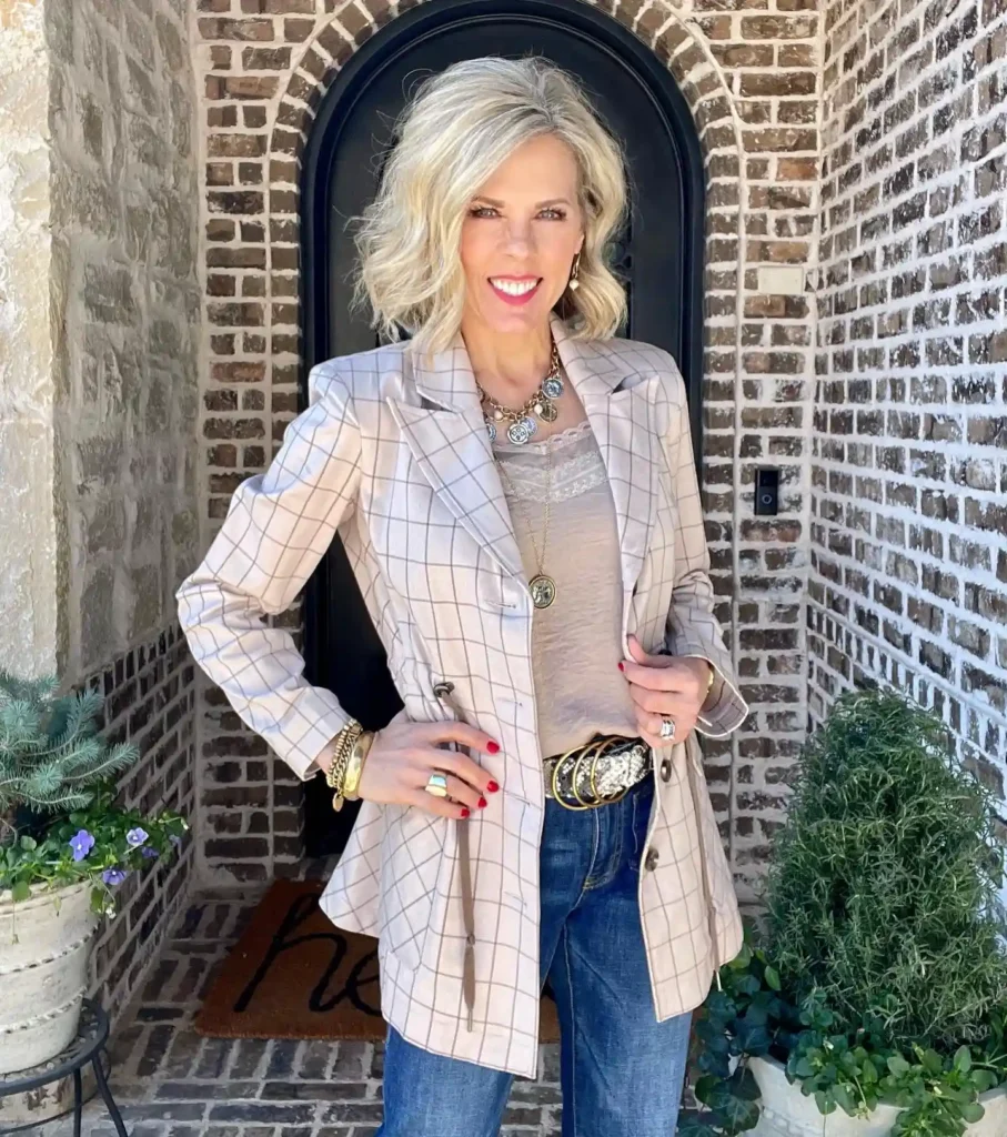 This outfit mixes structure with casual pieces. The checked blazer adds pattern and shape, while the jeans keep it relaxed. A simple top underneath keeps the focus on the blazer.