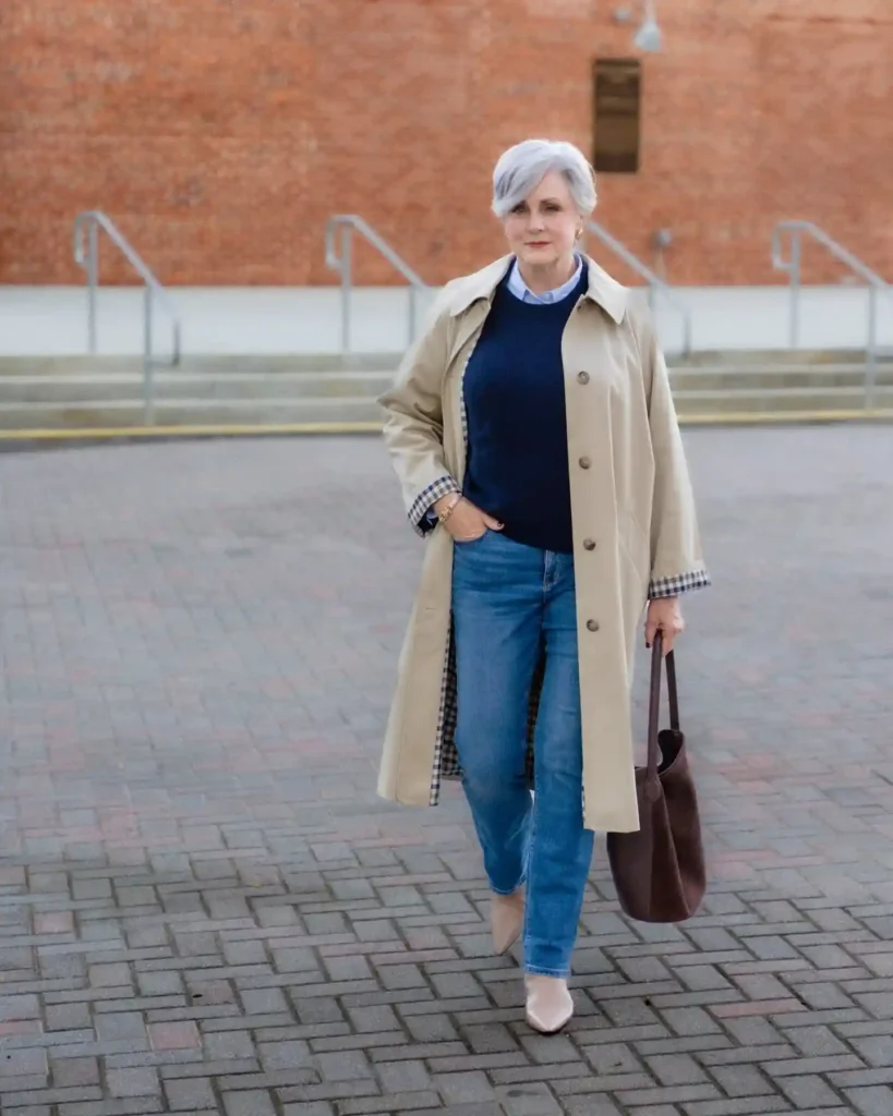 A timeless trench coat paired with straight-leg jeans is one of the easiest ways to look put together without overthinking it. The neutral coat adds structure, while the dark sweater underneath keeps the look grounded and practical. This kind of outfit works across seasons, especially for everyday errands or casual outings.