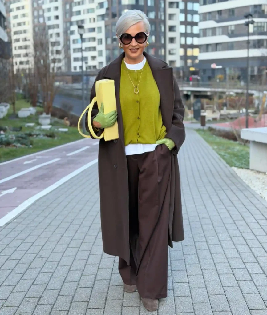 This outfit shows how to wear color without going overboard. The bright knit adds energy, while the brown coat and trousers ground the look. The layering feels intentional and well-balanced.