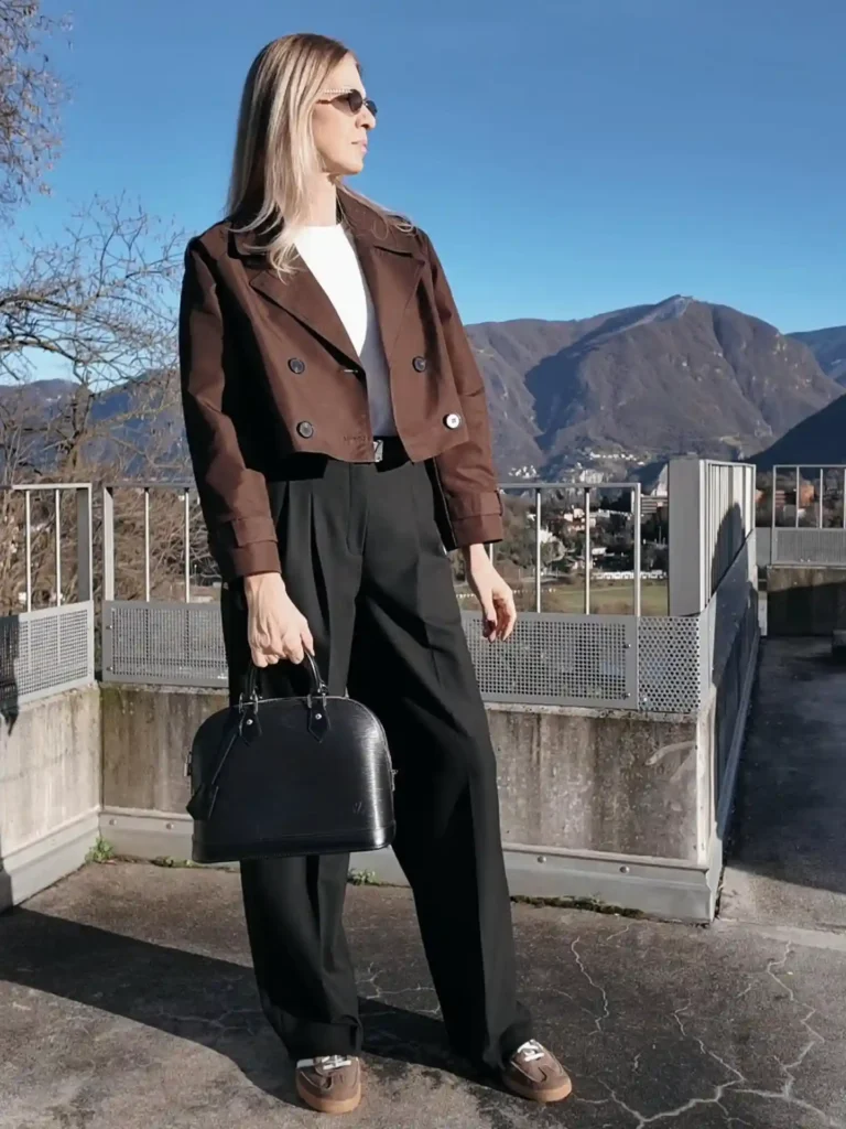 This look proves that proportions matter more than trends. A cropped brown jacket paired with high-waist black trousers creates a flattering silhouette that defines the waist and lengthens the legs. The clean white top underneath keeps everything fresh and balanced.