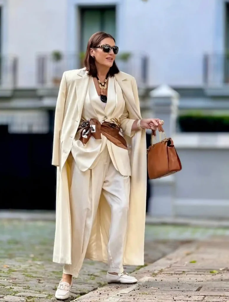 This outfit is a perfect example of how neutral tones can look expensive without trying too hard. A soft cream suit layered with a long coat creates a clean, elongated shape that instantly flatters. The silk scarf tied at the waist adds structure and a bit of personality without feeling overdone.